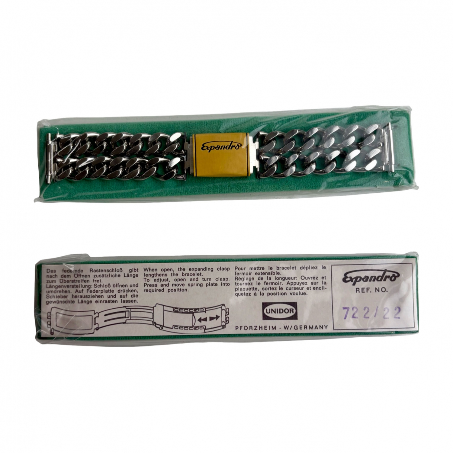 Deze originele Expandro horlogeband zit in de originele verpakking en is ongeveer 50 jaar oud. Aan de band zit de 2111820 sluiting, die op zichzelf al veel gezocht wordt door verzamelaars. Deze sluiting is in lengte verstelbaar in 5 stapjes en maakt de band daardoor van 16 tot 17,3 centimeter lang.