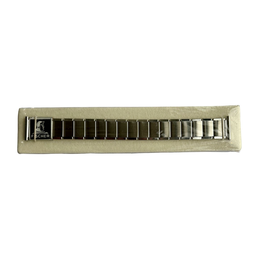 Een stalen horlogeband van Fischer - nieuwe oude voorraad (NOS) uit de jaren 1970. Deze vintage Fischer horlogeband zit in de originele verpakking en is ongeveer 50 jaar oud. Ideaal voor de liefhebber van vintages horloges die een echte vintage horlogeband aan het horloge wil hebben.