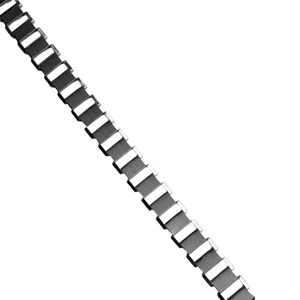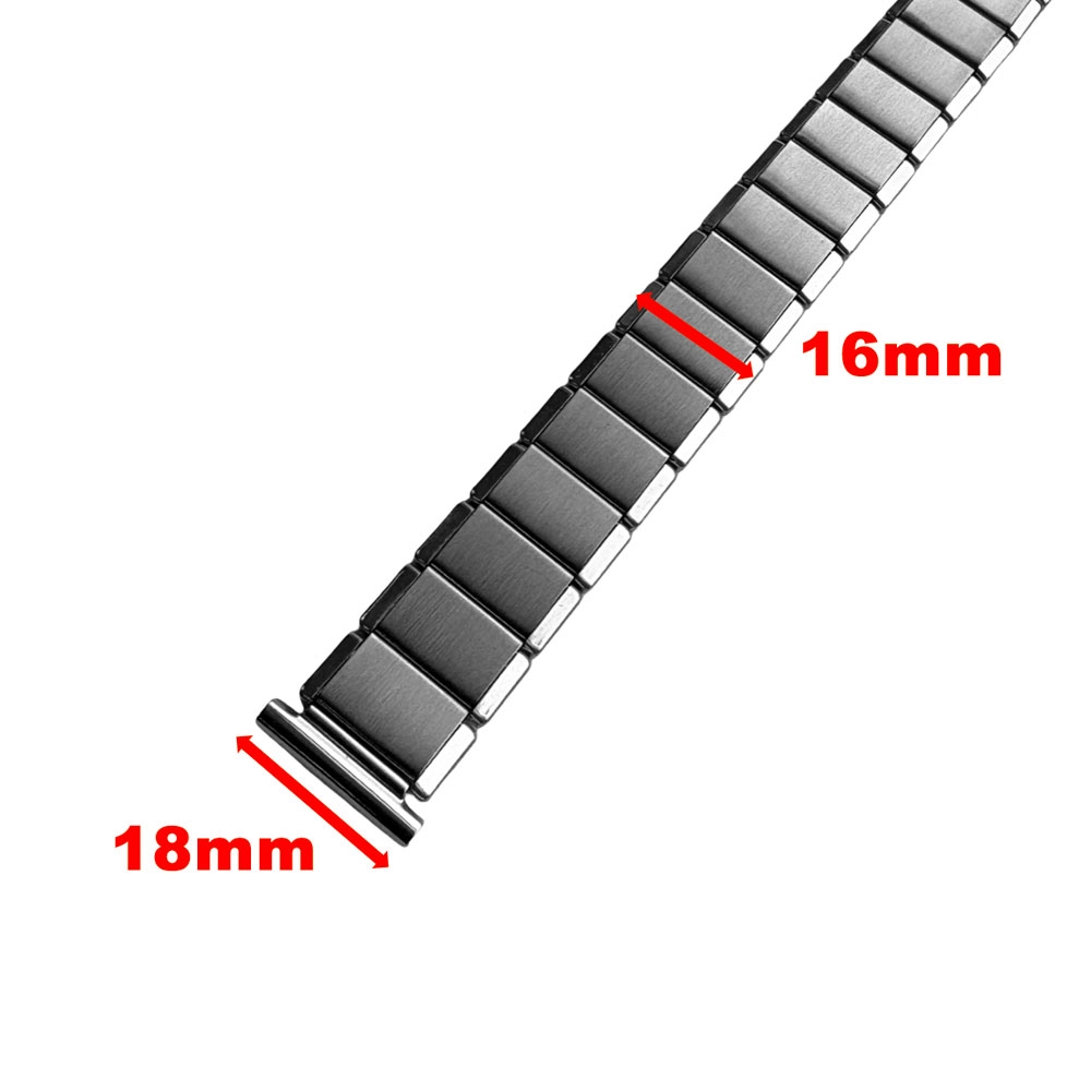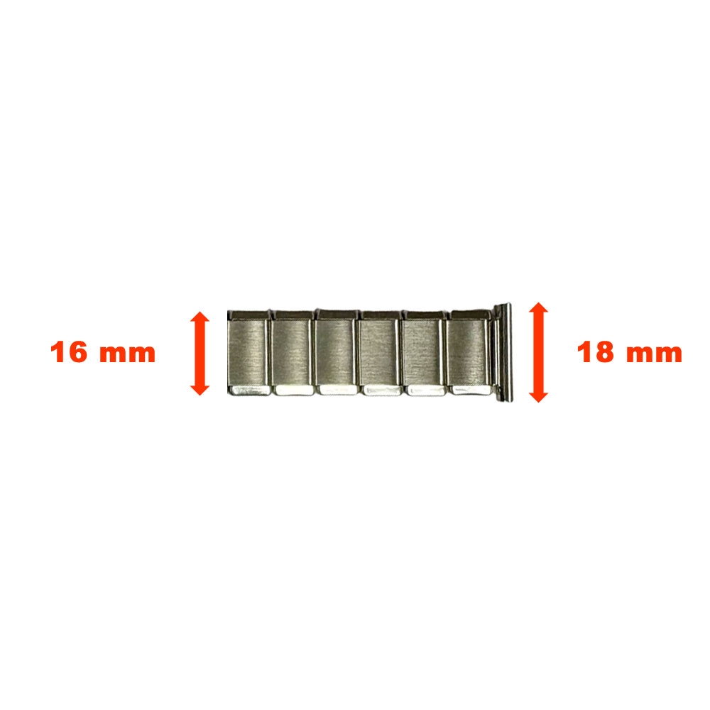 Deze horlogeband is een rekband - de schakels (die per stuk te verwijderen zijn om de band in te korten - kunnen uit elkaar rekken tijdens het om en af doen van het horloge. Iedere schakel is 8 mm breed, de band is te krijgen in naar keuze 18 of 19 schakels (met een totale lengte - zonder rekken - van 15,5 of 16.3 cm).