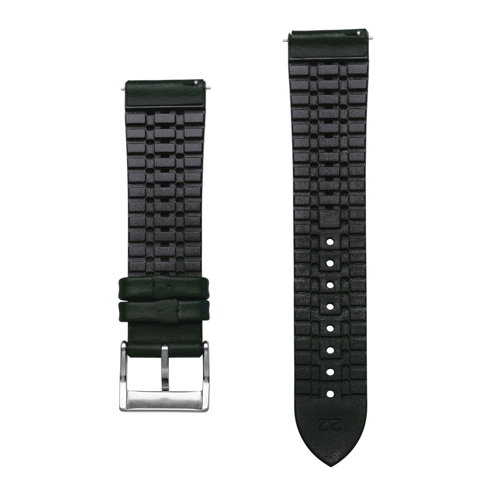 Deze horlogeband heeft een toplaag van leer op een soepel rubberen basis. De rubberen horlogeband heeft een open structuur, waardoor tussen de huid en de horlogeband constant zuurstof kan komen en daardoor veel prettiger draagt dan solide rubberen horlogebanden.
