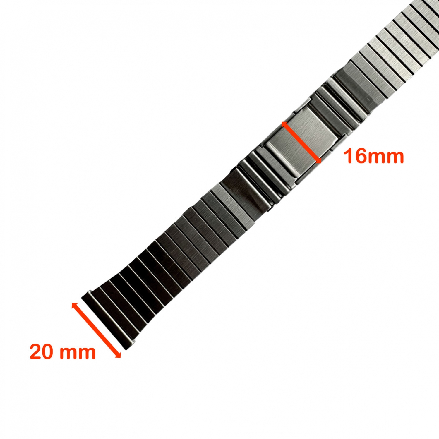 De horlogeband is bij de bevestiging aan het horloge 20mm breed en bij de sluiting 16mm. Zoals in de jaren 1970 gebruikelijk, kan het uiteinde smaller worden gemaakt met een veil, waardoor deze band ook geschikt is voor horloges met een aanzet van 18 of 19 mm. Wij adviseren deze horlogeband niet te kopen als uw polsomtrek groter is dan 18 centimeter.