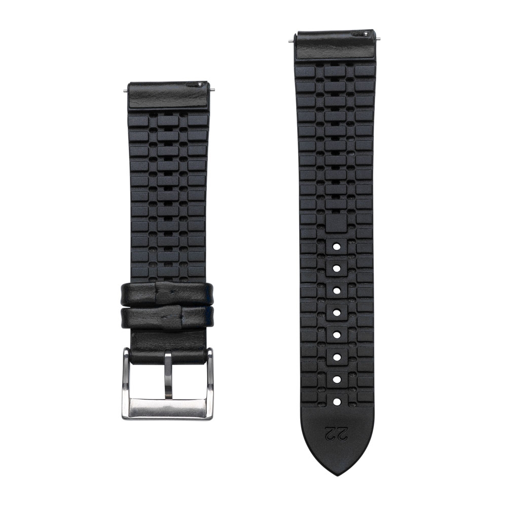 Deze horlogeband heeft een toplaag van leer op een soepel rubberen basis. De rubberen horlogeband heeft een open structuur, waardoor tussen de huid en de horlogeband constant zuurstof kan komen en daardoor veel prettiger draagt dan solide rubberen horlogebanden.
